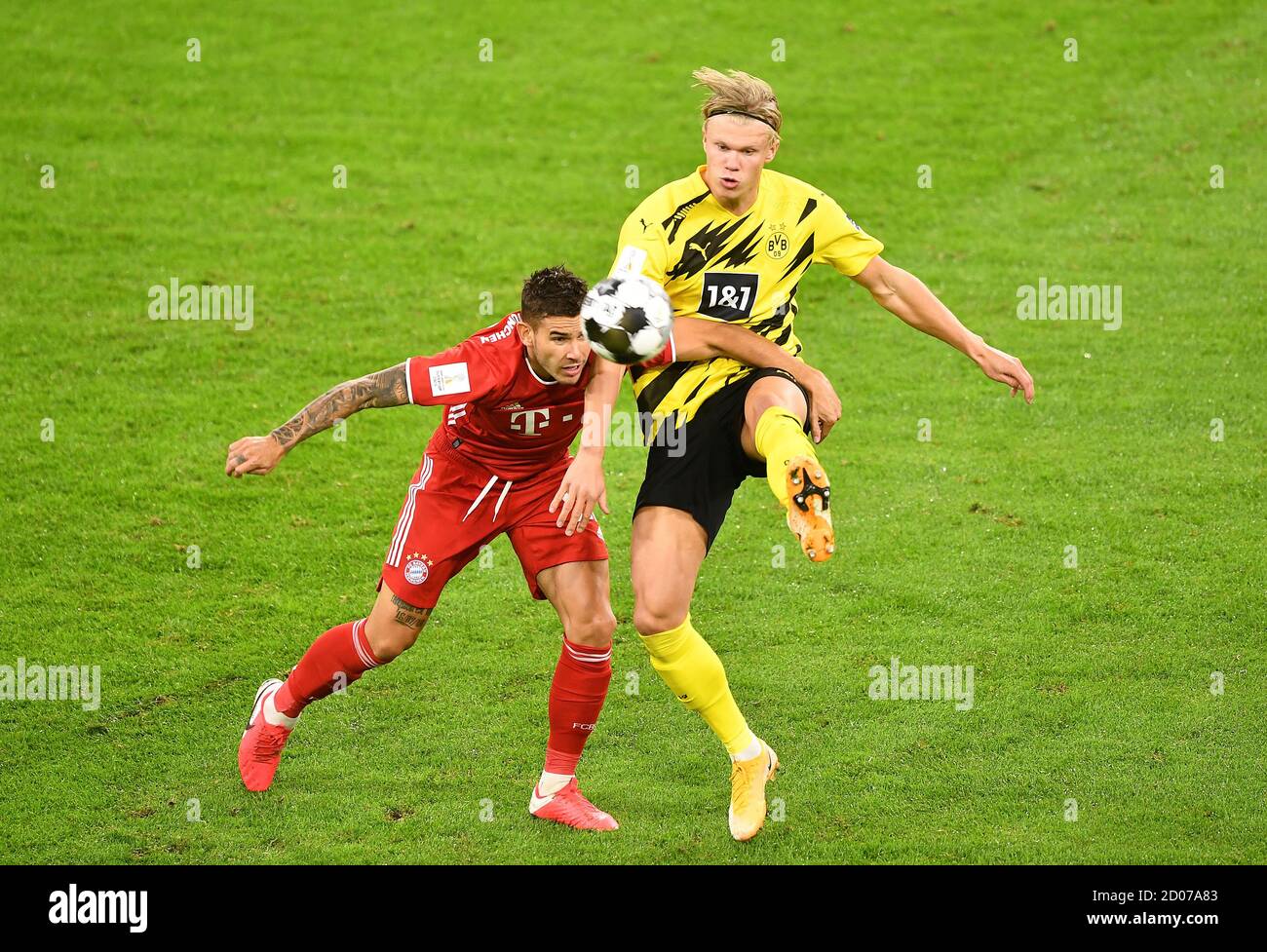 Lucas Hernandez Fc Bayern Munich Action Duels Versus Erling Haaland Borussia Dortmund Football Dfl Supercup 2020 Final Fc Bayern Munich Borussia Dortmund On 09 30 2020 Allianzaren A No Secondary Re Sale Within
